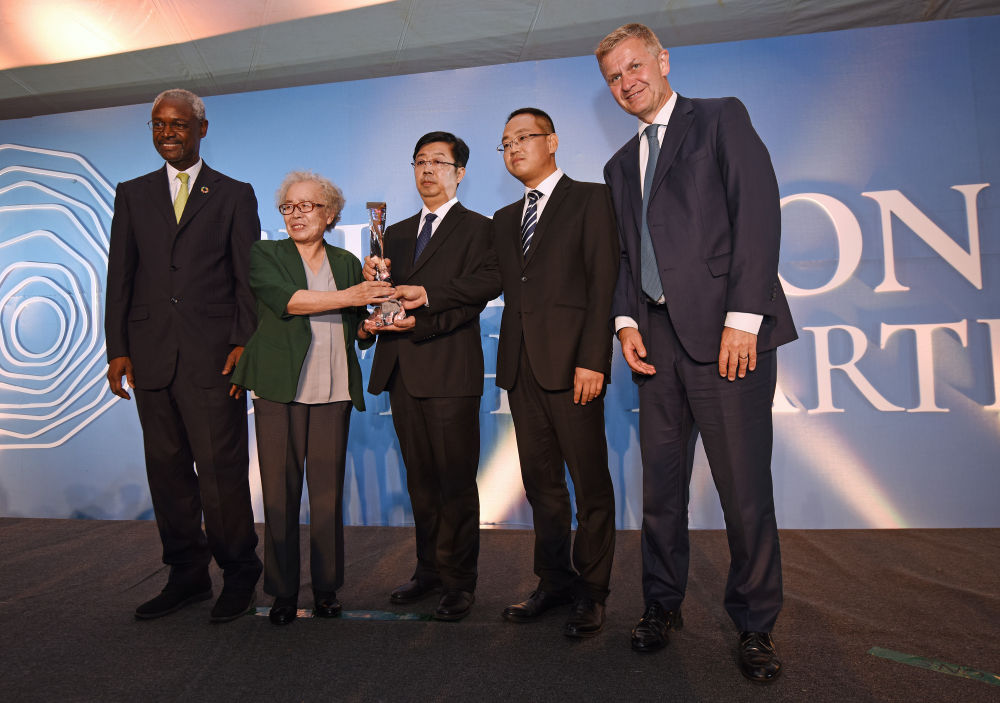 ↑在肯尼亞內羅畢聯合國環境規劃署總部,老、中、青三位塞罕壩人陳彥嫻(左二)、劉?,摚ㄖ校?、于士濤(右二)領取2017年聯合國環保最高榮譽——“地球衛士獎”(2017年12月5日攝)。