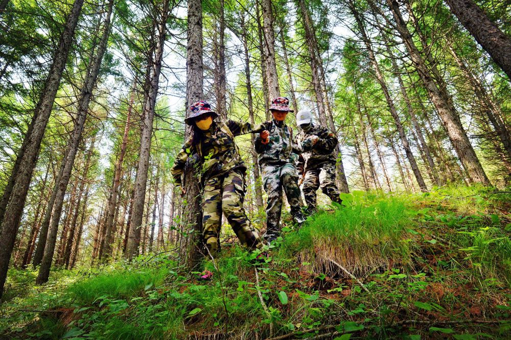 ↑工作人員行走在塞罕壩機械林場(2017年7月14日攝)。