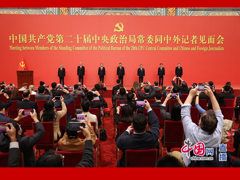 中國共產黨第二十屆中央委員會第一次全體會議新選出的中央政治局常委于23日中午12時許,同采訪中共二十大的中外記者見面。(中國網 劉 景)