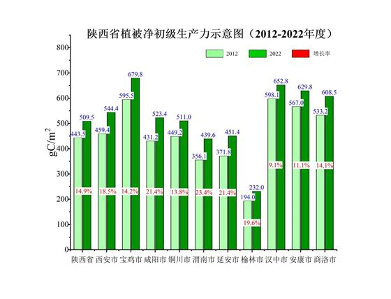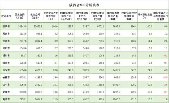 陜西省是中國版圖原點、腹心所在,堪稱中華家園中的內園、核心園,自然生態空間遭受經濟社會發展侵入的時間久、強度大。曾經最精美的生態空間已開辟為現在的城鎮、鄉村,有幸保留下來的生態空間也已歷經掏挖劫掠、生態系統功能遭受重創,生態蛋糕已遠非洪荒之時的味道。進入新時代,在綠水青山就是金山銀山理念引導下,生態空間發生了廣泛而深刻的綠色革命,促進了生態生產力持續增長。陜西省生態空間數據中心演算結果顯示,2022年全省生態空間植被凈初級生產力水平為339.7公斤/畝,比2012年的295.7公斤/畝增加44公斤/畝,增長14.9%。全省生態空間植被凈初級生產量由2012年的6701.1萬噸增加到7697.5萬噸,增加996.4萬噸,增長14.9%。