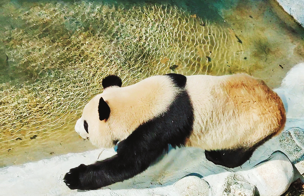 大熊貓走向圈舍內的水池,準備享受清涼的沐浴。李弋戈 攝