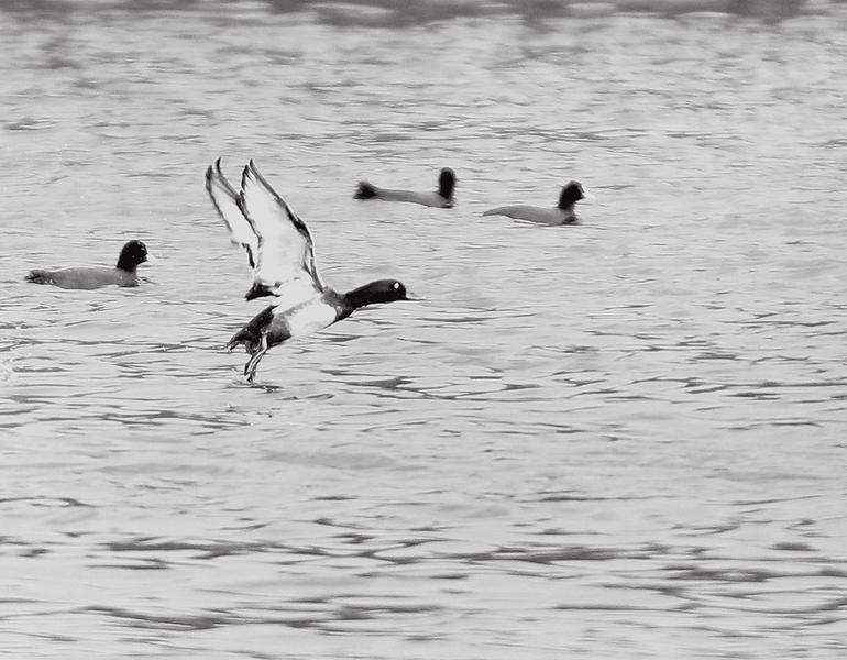 當天11時許,工作人員正在公園進行視頻巡視,突然幾只黑色的身影出現在鏡頭中。經過仔細觀察,工作人員發現,有幾只樣貌特殊的小鳥在湖面覓食,便立即趕到附近觀察。只見寬闊的湖面上波光粼粼,多只周身褐色、眼周為白色的小鳥正在湖面上嬉戲,看起來悠然自得。工作人員立即拍攝其影像,后經專家辨認該物種為青頭潛鴨。