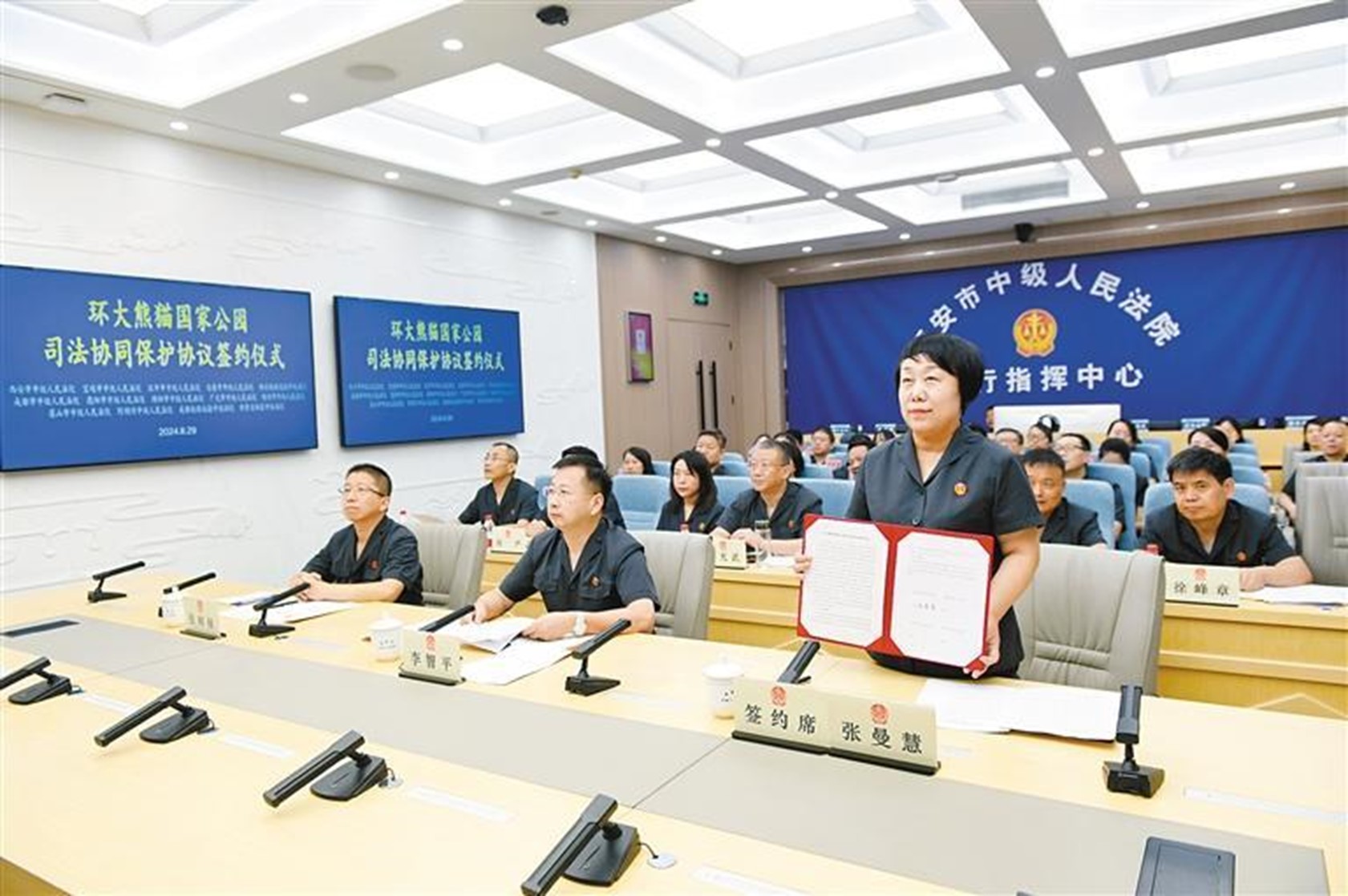 8月29日,陜西省西安市中級人民法院與陜西、四川、甘肅三地的13家中院(即陜西省的寶雞市、漢中市、安康市中級人民法院,西安鐵路運輸中級法院,四川省的成都市、德陽市、綿陽市、廣元市、雅安市、眉山市、阿壩州中級人民法院,成都鐵路運輸中級法院,甘肅省林區中級法院)共同簽署《環大熊貓國家公園司法協同保護協議》。簽約儀式采取視頻連線的形式,主會場設在西安市中級人民法院執行指揮中心。
