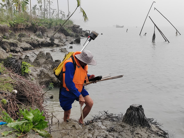 測量組長程登峰大年初二在海灘進行物理點測量工作
