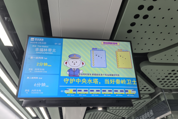 西安地鐵2號線站臺上電視屏播放秦嶺保護宣傳標語