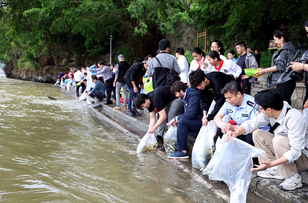 隨后,大家步行至水東門碼頭,開展了人工增殖放流活動。一尾尾活蹦亂跳的魚苗被放入漓江,為漓江生態注入新的活力。