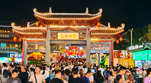 在益田西街,傳統與現代的碰撞擦出別樣火花。旅拍成為街頭一道亮麗風景線,身著精美古裝、絢麗民族服飾的游客絡繹不絕。在專業攝影師的指導下,她們以古色古香的街道、高懸的紅燈籠和特色店鋪為背景,定格下美好瞬間。街道兩旁美食飄香,各類特色小吃攤位鱗次櫛比。這里既有桂林米粉、特色酸嘢等廣西本土風味,也匯聚了長沙臭豆腐、傣味舂雞腳等全國各地的知名小吃,滿足不同游客的味蕾需求。