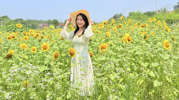 6月6日清晨,湖南省邵東市周官橋鄉聯合村九六農莊,薄霧初散,晨光熹微。100畝、30萬株向日葵齊刷刷抬起金黃的臉龐,在田野間掀起壯闊的金色浪潮。飽滿的花盤如磨盤,鑲嵌著密集的葵花籽,微風吹拂,細茸茸的莖稈托起一個個沉甸甸的“小太陽”?;◤街?,頭戴草帽的游客彎腰取景,快門聲中,少女的碎花裙擺與黃瓣綠心的花朵撞色相映,驚起幾只白蝶翩躚飛向湛藍天際。農莊負責人劉黎指著遠處搖曳的新品種介紹:“今年比去年多栽了2萬株,這片浮光躍金的‘花?!A計將持續‘亮’到六月下旬?!?/p>