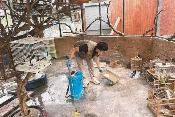 陳濤在打掃籠舍,為鳥兒準備鳥食。