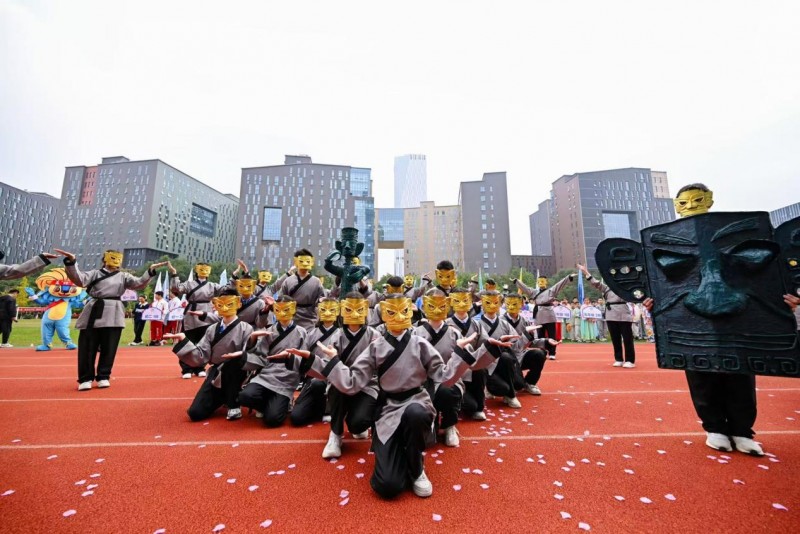 運動會方陣在學生自主設計的吉祥物“美師寶”——一只象征“美視”與“師一”合璧、力量與勇氣匯集的獅子的引領下,依次走過主席臺,開幕式現場瞬間化身為流動的巴蜀文化長廊。