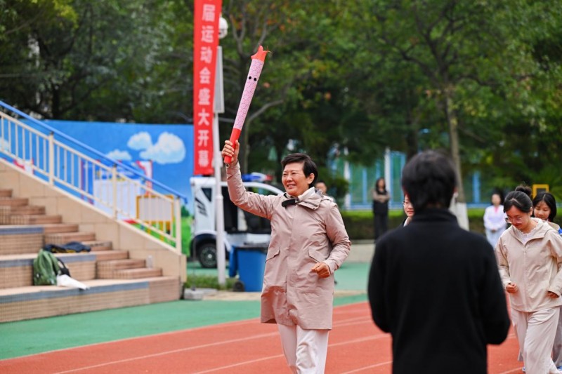 在方隊入場后,辛勤付出的教師代表、熱心家校工作的家長委員,還有品學兼優的學生骨干相繼傳遞火炬,最終由皮劃艇世界冠軍趙曉莉與校長唐國共同點燃拼搏之炬。