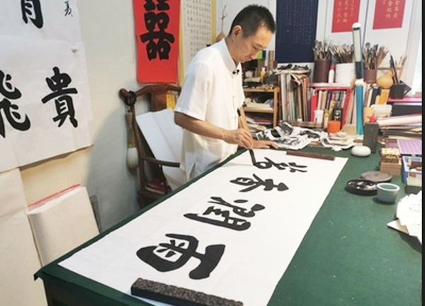 說起薛鏞的書法,應從他的少年時期的啟蒙開始。少年時,看著伯父幫鄰里們寫春聯時揮灑自如的神情,聽著周圍鄉鄰們發出的贊嘆聲,他就已經心馳神往。上學后,他把書法的滿腔熱情傾注到寫仿上,只要-有空閑,就筆不離手,伏案勞形,通宵達旦。
