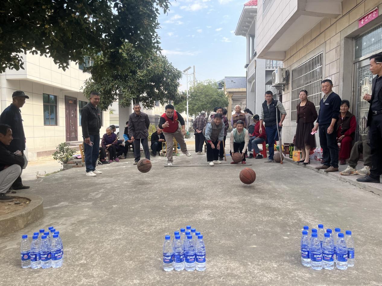 另一邊,紫荊村的趣味游戲區同樣熱鬧非凡?!班l村保齡球”環節,大家拿起籃球對準擺成陣列的礦泉水瓶,瞄準、投擲一氣呵成;“趕雞進籠”游戲里,老人們手持輕巧扇子,目光專注地盯著印有“土雞”圖案的氣球,輕輕發力將氣球“趕”向終點,動作間滿是童趣;“圈圈套?!庇螒蚋桥牌鹆碎L隊,老人們站在指定線外,瞄準心儀的醬油、肥皂、抽紙等日用品投擲套圈?!爸辛?!中了!”隨著一聲聲歡呼,成功套中心儀物品的老人臉上綻放出燦爛笑容,沒套中的老人也在大家的安慰下笑著繼續嘗試,歡樂與滿足的氛圍感染著在場每個人。