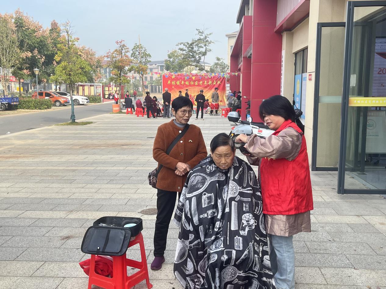 活動伊始,豐畈社區的公益義剪現場便排起了長隊。志愿者們耐心詢問每位老人的發型需求,手持剪刀細致修剪,一邊理發一邊與老人拉家常,叮囑他們注意秋冬保暖?!凹敉觐^發清爽多了,你們想得太周到了!”剛理完發的王奶奶看著鏡子里精神的自己,笑得合不攏嘴。義剪結束后,文藝表演正式登場,極具地方特色的“跑竹馬”舞蹈率先亮相,演員們身著艷麗服飾,伴著歡快的鼓點靈活穿梭,生動的演繹贏得臺下老人陣陣掌聲。隨后,《祖國》《沒有共產黨就沒有新中國》等經典歌曲輪番唱響,熟悉的旋律勾起了老人們的時代記憶,不少人跟著輕聲哼唱,現場氛圍愈發熱烈。