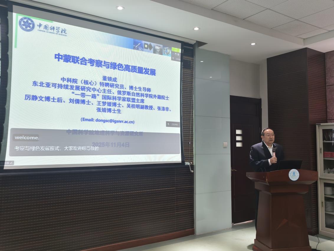 中國科學院地理科學與資源研究所董鎖成研究員(俄羅斯自然科學院外籍院士、“一帶一路”國際科學家聯盟主席)以《中蒙聯合科學考察與綠色發展模式》為題,從國家戰略高度剖析中蒙共建“綠色長城”及邊境生態安全屏障的重要性。他詳細介紹了 2005-2025年中蒙聯合考察 20年歷程中的關鍵進展,同時指出當前蒙古高原仍面臨草原退化、水資源短缺等生態風險,強調需通過綠色高質量發展模式,推動區域生態保護與經濟社會協同發展。